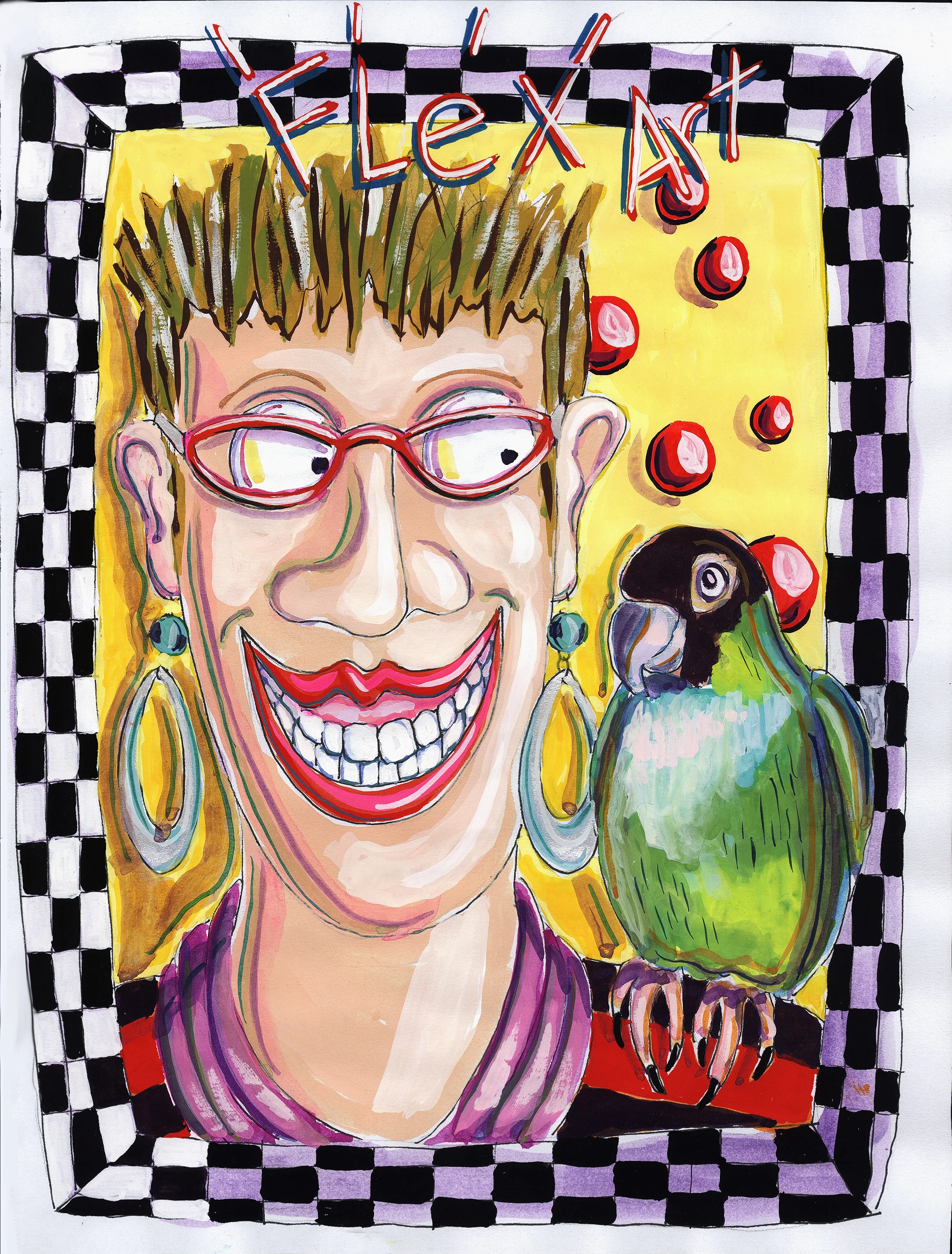 My work is about color, pattern and storytelling with a little humor and irreverence thrown in. It takes a couple of different forms, one being gouache on paper and the other 3D pieces constructed out of roofing aluminum and plywood painted with either gouache or oils. I work in a cartoony figurative style inspired by such artists as Red Grooms, Roger Brown and the Chicago Hairy Who. Other influences are outsider art, gothic religious art and indian miniature painting. My subject matter runs from observations about American popular culture to portraits of people I know or admire to rooms which depict exaggerated scenes from my own life.